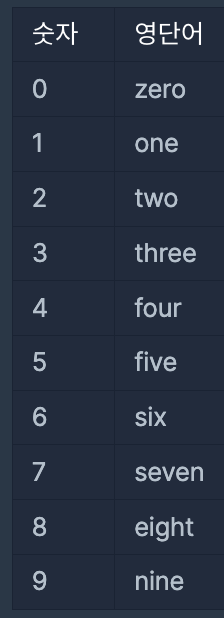 참고로 각 숫자에 대응되는 영단어는 다음 표와 같습니다.
