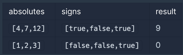 - signs가 [true,false,true] 이므로, 실제 수들의 값은 각각 4, -7, 12입니다.