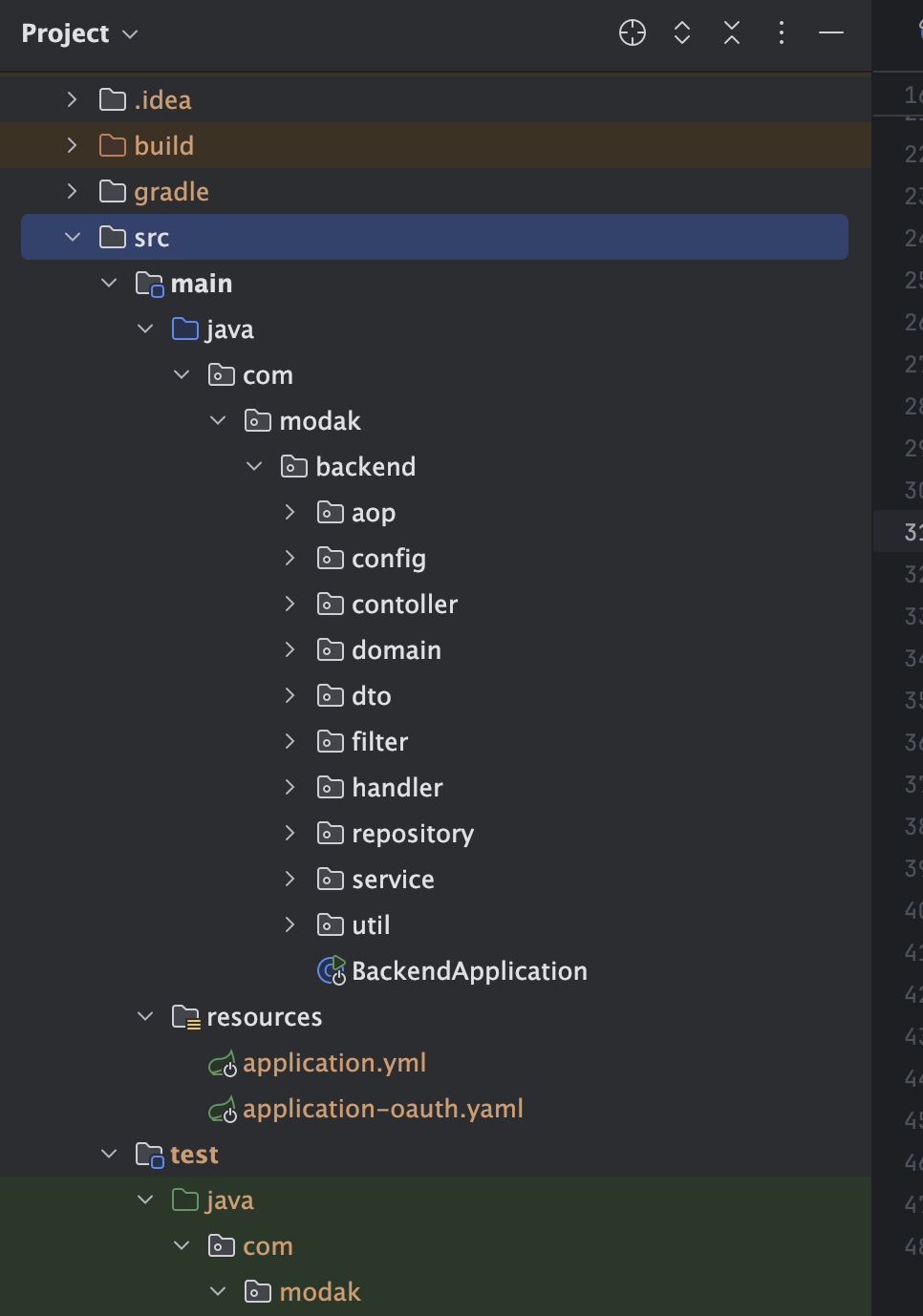 - config : 서버에 관한 전반적인 자바 빈으로 설정한 파일이 모아져 있는 곳이다. 시큐리티, 스웨거 등을 여기서 설정한다.